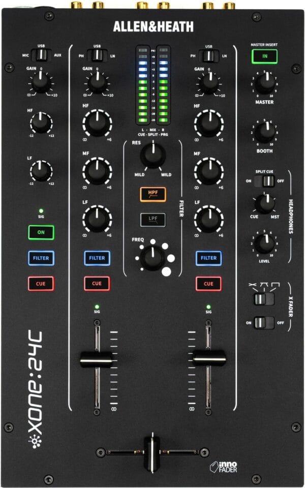 | Il Xone:24 è un mixer DJ analogico compatto a 2+1 canali, progettato per chi cerca suono professionale e controllo tattile anche nei setup di dimensioni ridotte. Perfetto per DJ che utilizzano vinili, media player digitali o vogliono semplicemente la purezza del suono analogico, offre la qualità sonora tipica dei mixer Allen & Heath in un formato pratico, intuitivo e robusto. Al cuore del Xone:24 si trova un percorso del segnale interamente analogico, meticolosamente progettato per restituire chiarezza, calore e profondità — caratteristiche che definiscono da sempre il suono Xone. Due preamplificatori RIAA ad alto guadagno e basso rumore garantiscono una riproduzione fedele del vinile, mentre gli ingressi Phono/Line commutabili consentono di passare rapidamente da giradischi a lettori digitali senza variazioni di livello o qualità. L’equalizzatore isolatore a 3 bande offre un controllo preciso e musicale, ideale per scolpire le frequenze, creare transizioni fluide o ridefinire le linee di basso. Elemento distintivo della serie, il filtro Xone:VCF, derivato dai modelli di punta del marchio, offre modalità low-pass e high-pass, con controllo di frequenza e risonanza regolabile dal delicato al più estremo, permettendo di modellare il suono in modo creativo e dinamico. Il Mini innoFADER assicura un crossfader morbido, preciso e resistente, perfetto per mixaggi fluidi e performativi. I pulsanti retroilluminati, il metering reattivo e la dotazione completa di connessioni rendono il Xone:24 un mixer affidabile e versatile, pronto a supportare qualsiasi performance, in club, in studio o a casa. Grazie al loop Master Insert FX, l’integrazione di effetti esterni diventa semplice e immediata tramite le connessioni send/return posteriori. Nei contesti professionali, il Master Insert può anche essere utilizzato per collegare processori di dinamica, offrendo un controllo più preciso sul segnale principale. Compatto, elegante e costruito per durare, il Xone:24 rappresenta una porta d’ingresso ideale nel mondo Xone, unendo tradizione analogica, qualità sonora superiore e massima praticità operativa. |