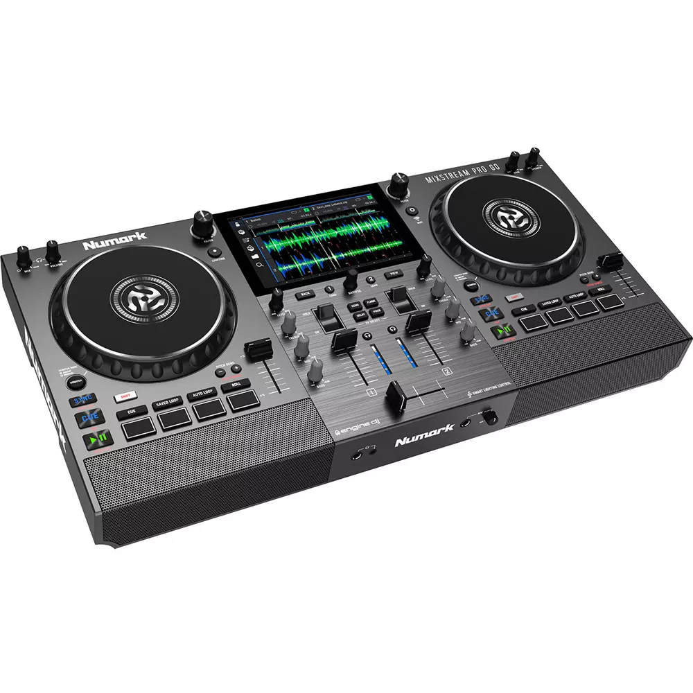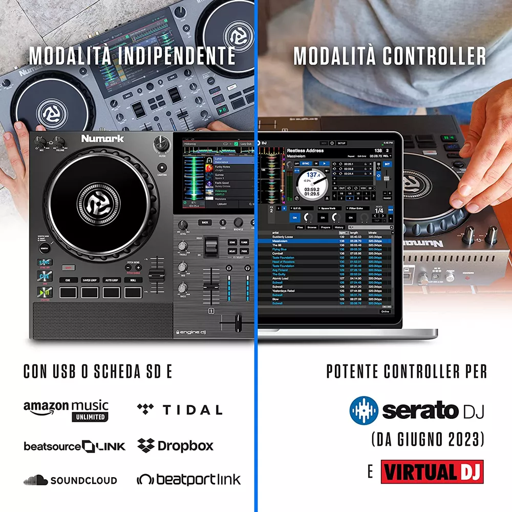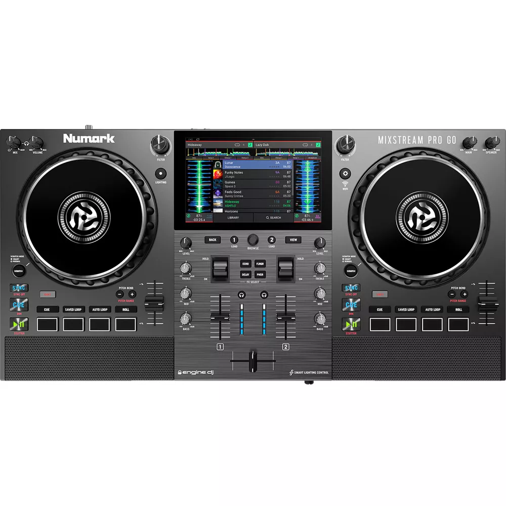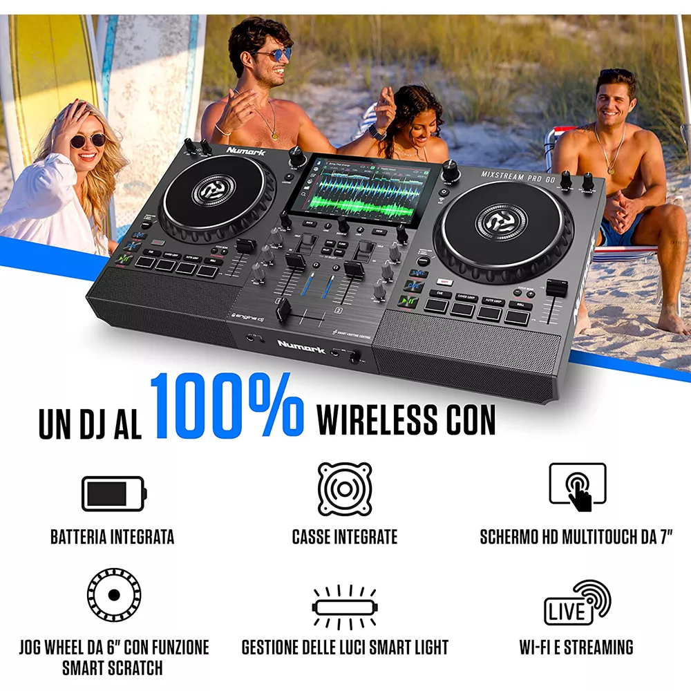 MIXSTREAM PRO GO di NUMARK è una consolle professionale per dj dotata di batteria ricaricabile, diffusori integrati, connettività wi-fi, slot per schede usb/sd e controllo luci. evoluzione dell’apprezzatissima ‘mixstream pro’, offre la possibilità di suonare anche senza il collegamento alla rete elettrica per un massimo di 5 ore. caratterizzata dal classico layout di una consolle a 2 canali e la comodità dello schermo multi-funzione touch, risulta molto intuitiva e semplice da utilizzare anche per chi non ha grande dimestichezza con il djing. è dotata di 2 slot usb e 1 slot per schede sd, inoltre non importa se la propria libreria proviene da rekordbox, itunes o serato, infratti grazie al software ‘engine dj’ la compatibilità e la conversione sono sempre assicurate (‘engine’ non ha rivali nell’analisi dei pezzi, anche se non sono mai stati riprodotti). al pari del modello precedente (‘mitream pro+’) anche questa si integra con amazon music unlimited e altri servizi musicali di streaming, con accesso praticamente illimitato ad oltre 100 milioni di brani di tutti i generi, grazie al modem wi-fi integrato. gli speaker integrati di alta qualità dispongono di controllo del volume indipendente, e nonostante le dimensioni contenute erogano un suono potente e qualitativo, tanté che si prestano per sostituire in maniera egregia la classica cassa spia. oltre ad essere una consolle per dj può essere usata anche come ‘controller luci, infatti è compatibile con il protocollo phillips hue e nanoleaf, consente di ottenere effetti visivi istantaneamente e perfettamente sincronizzati al flusso musicale, con risposta ai movimenti del crossfader, del volume o ancora allo scratch, con opzioni per la selezione personalizzata del colore, sequenza di scene, effetto strobo e molto altro, al fine di ottenere un’esperienza audio/visiva straordinariamente coinvolgente. inoltre, per un controllo del set di luci avanzato, si possono sfruttare le potenzialità del software opzionale soundswitch, con il quale è possibile analizzare la propria libreria musicale, quindi esportarla su chiavetta usb, oppure su scheda sd o ancora sul proprio cloud dropbox, per avere il pieno controllo dmx utilizzando lo schermo touchscreen, evitando quindi di portarsi al seguito laptop e/o centralina dmx. a seguire ne elenchiamo le principali caratteristiche: