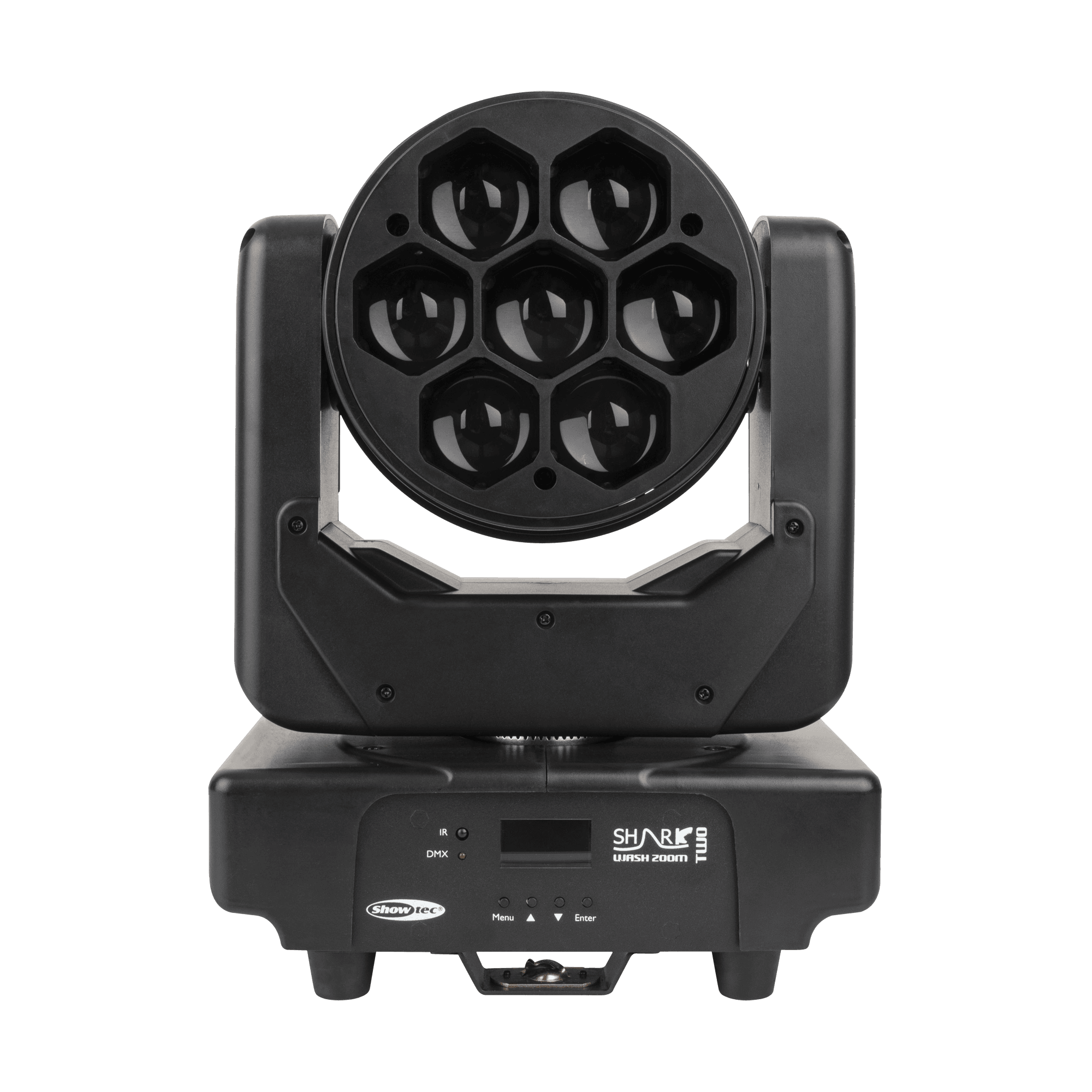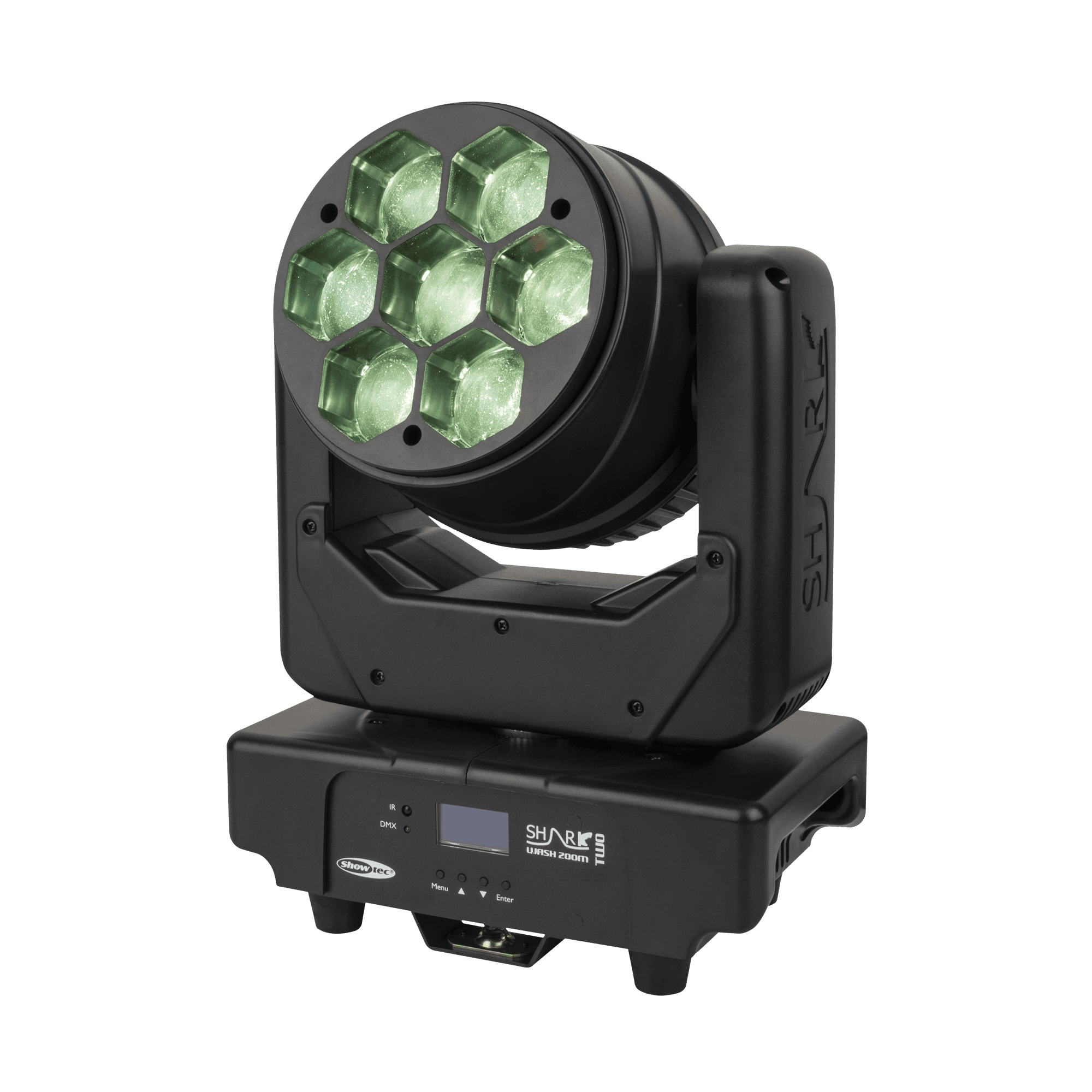 Showtec Shark Wash Zoom Two è una testa mobile wash adatta per uso interno con sette LED RGBW da 30 watt integrati. Grazie al suo zoom motorizzato, può produrre senza sforzo un classico effetto wash con un angolo del fascio luminoso compreso tra 6° e 38°. Le funzioni dimmer e strobo rendono questo wash testa mobile ancora più versatile. Shark Wash Zoom Two può funzionare in modalità DMX, automatica o audio come master o slave, oppure può essere azionato utilizzando il telecomando incluso.