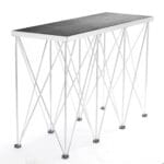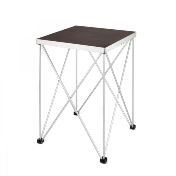 Tavolo dj richiudibile composto da struttura a ragno 50×142 xm in alluminio anodizzato e ripiano in multistrato di betulla 50×142 cm con profilo in alluminio.